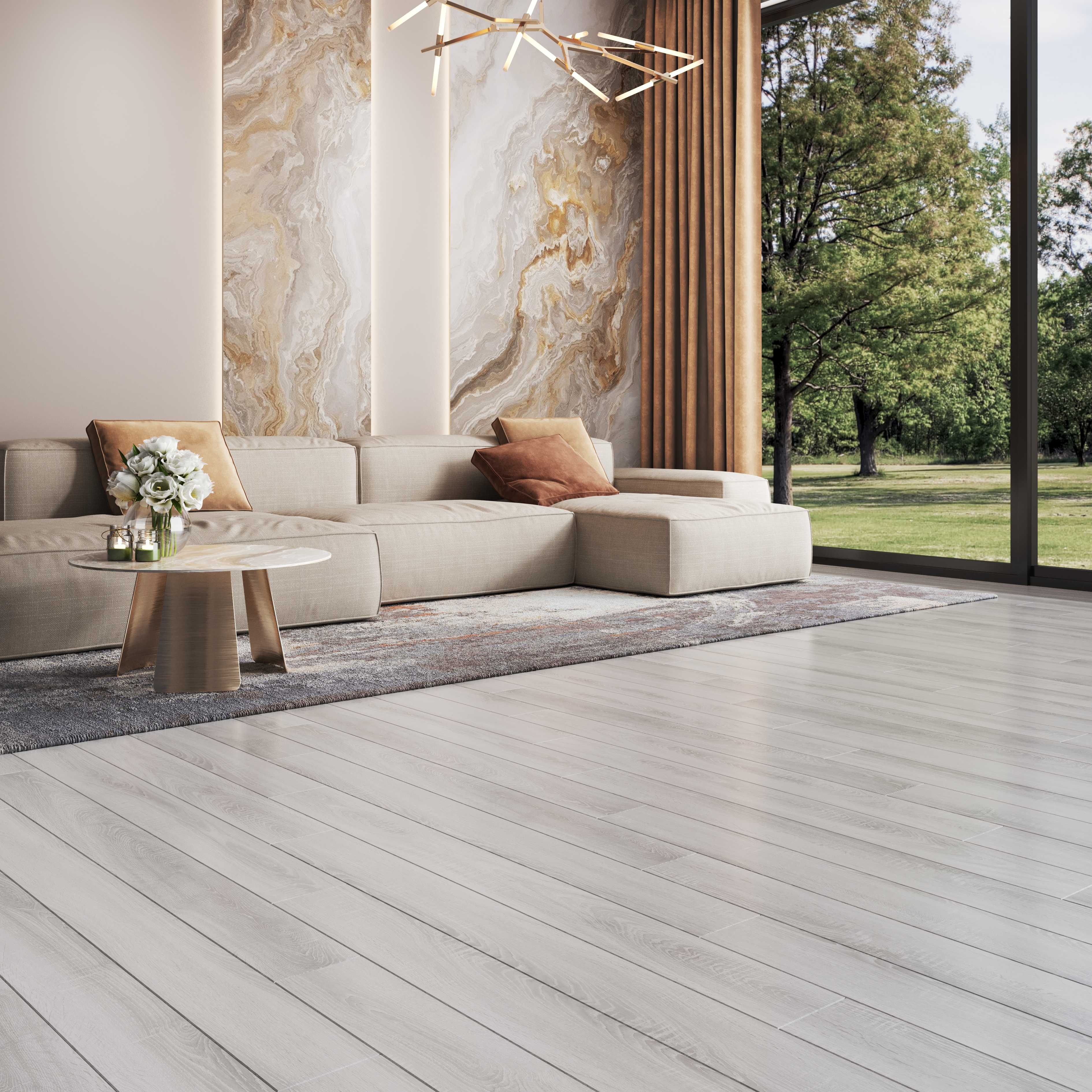 Поверхность пола отражает свет, а мягкий блеск дает ощущение легкости и изящности.