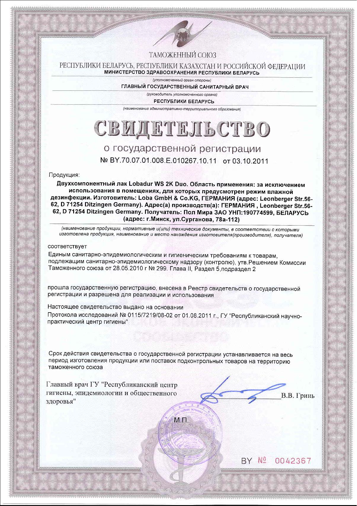 Техника безопасности: Даже при работе с лаком LOBADUR WS 2K Duo, который содержит очень незначительное количество опасных веществ, следует соблюдать общепринятые меры предосторожности: хранить в недоступном для детей месте, на рабочем месте запрещается принимать пищу, пить, курить. Работать с лаком следует в защитных перчатках. Обеспечить хорошую вентиляцию в рабочем помещении. Попавшие на кожу и одежду частицы лака - смыть водой. Особых требований по пожарной безопасности не имеется.